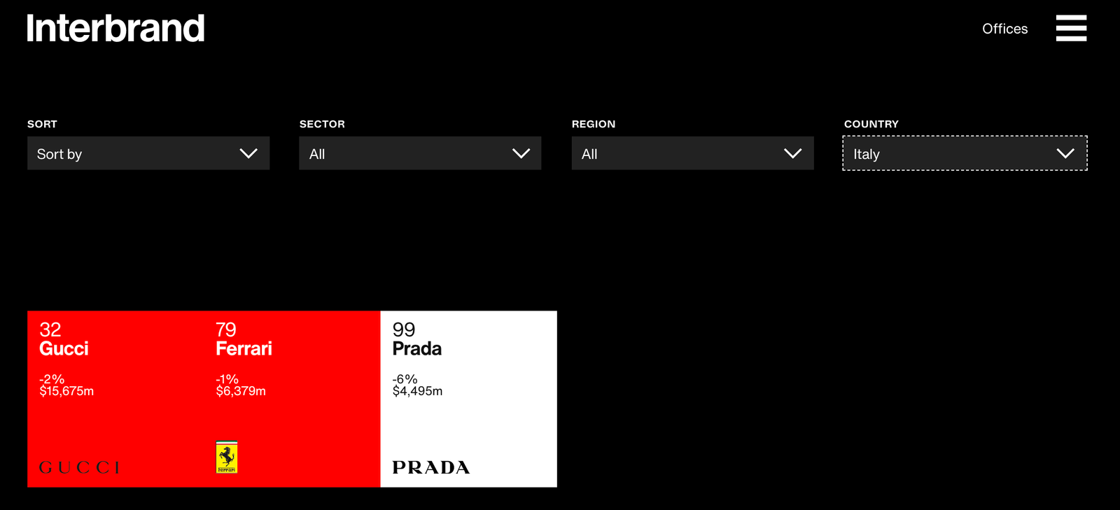 Tra i brand italiani che resistono in TOP 100 troviamo Gucci al N. 32 (-2%), Ferrari in posizione 79 (-1%) e Prada in posizione 99 (-6%)