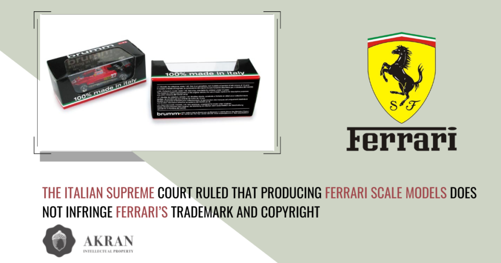 The Italian Supreme Court ruled that producing Ferrari scale models does not infringe Ferrari’s trademark and copyright